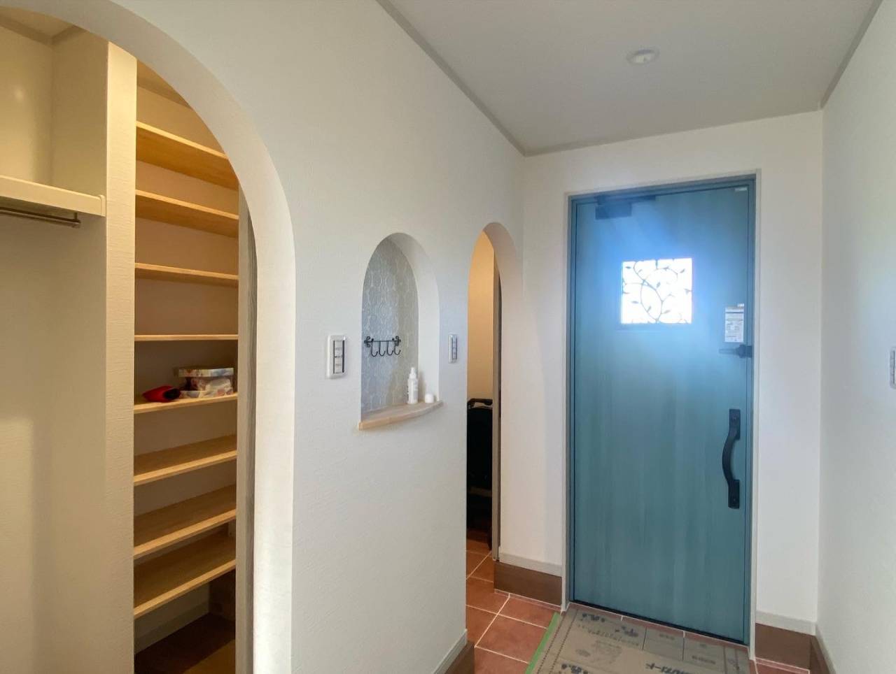 まず目に入るのは、左右のアーチ型の扉と中央のニッチ。直線ではなく、曲線で描かれたアーチ形状が、空間全体にやわらかな雰囲気を生み出しています。白い壁に映える木目のやさしい色合いも相まって、ナチュラルで心落ち着く印象を与えてくれます。