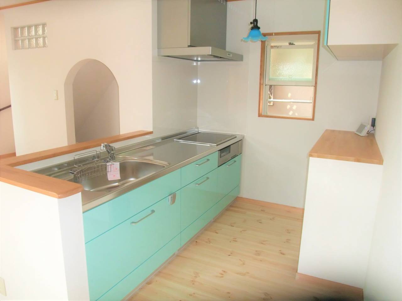 アーチの向こうに見えるキッチンは、シンプルながらも温かみのある造作。