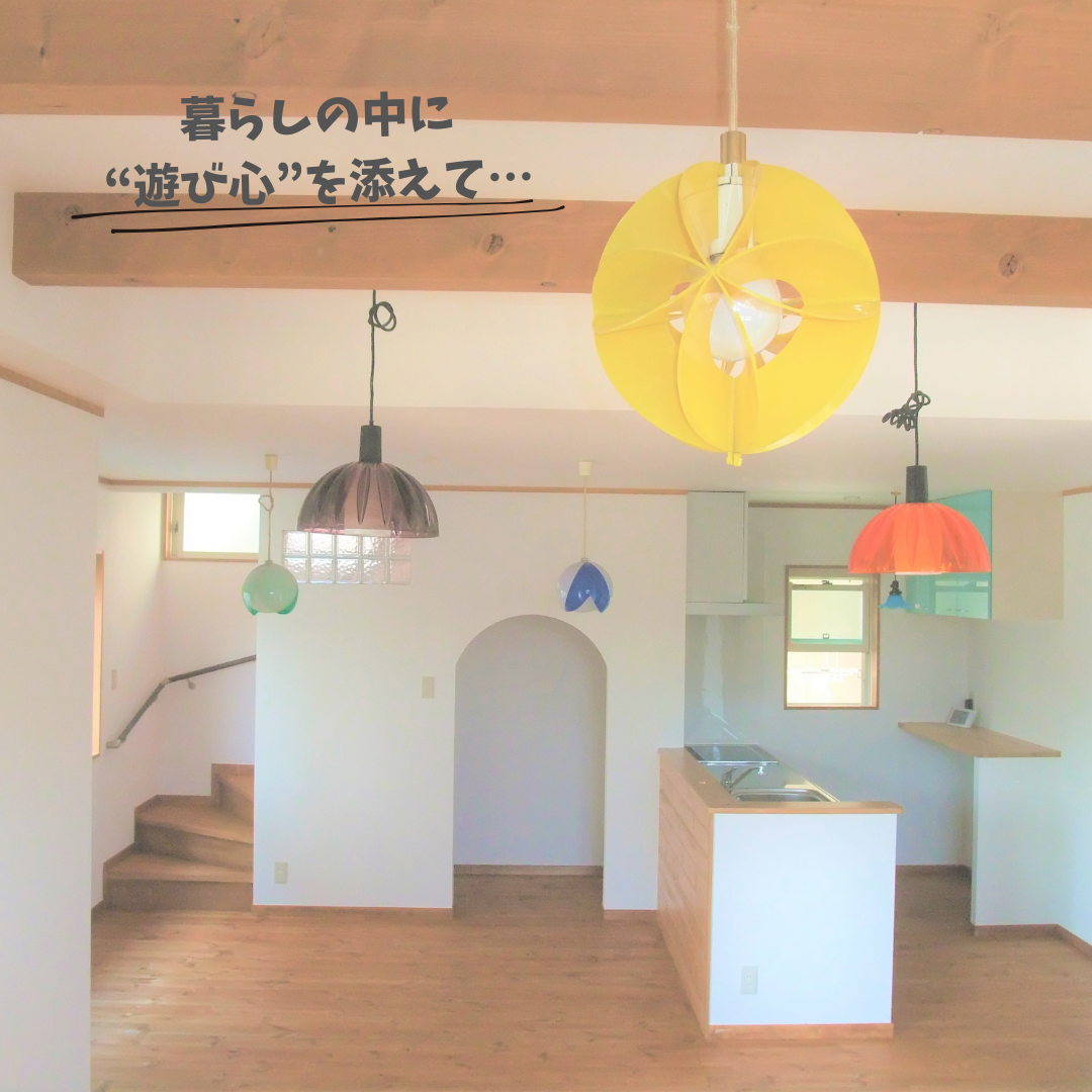 そこに吊るされたカラフルな照明たちが、この家の“遊び心”をそっと語りかけてくる。