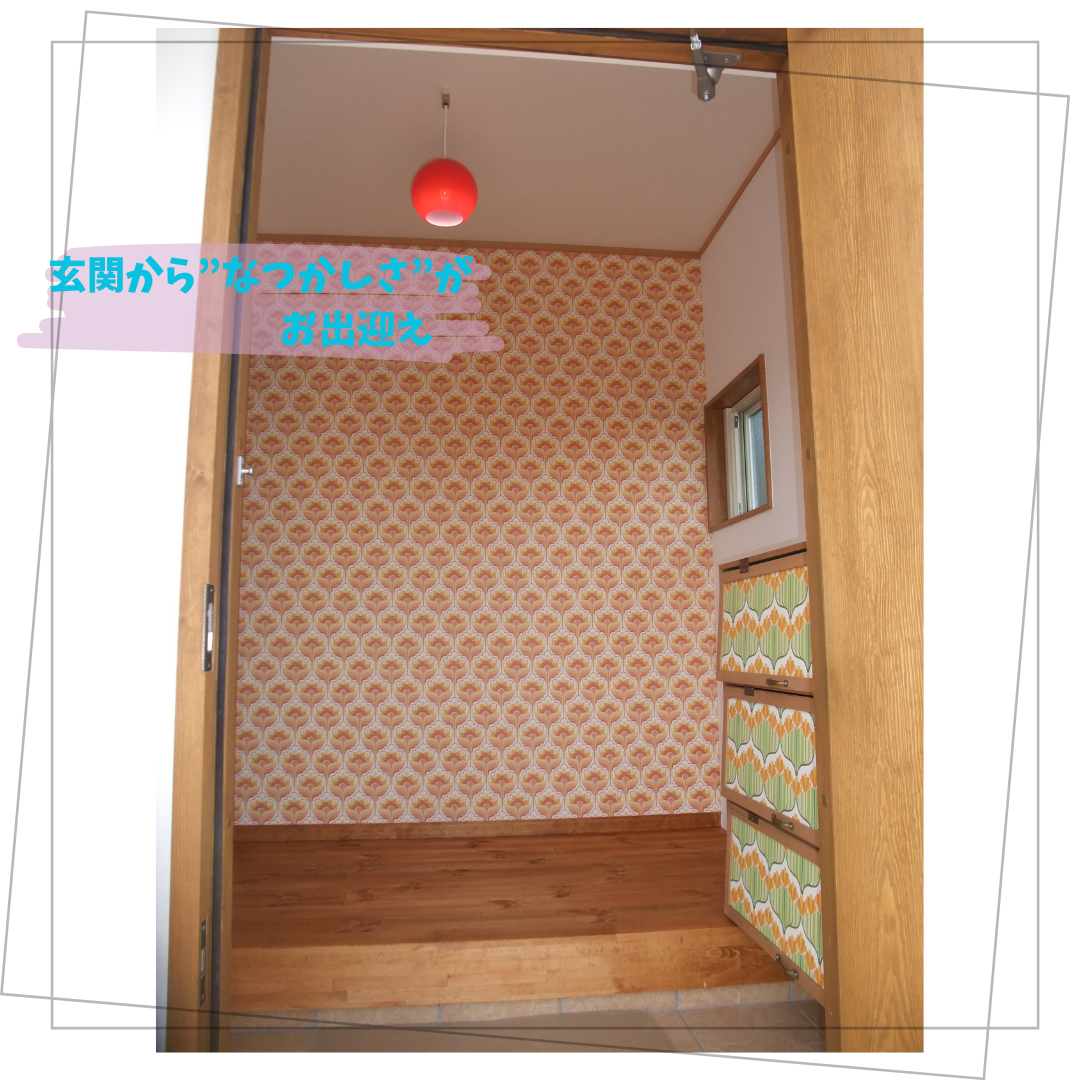 玄関横には、レトロ調の柄をあしらった収納スペース。