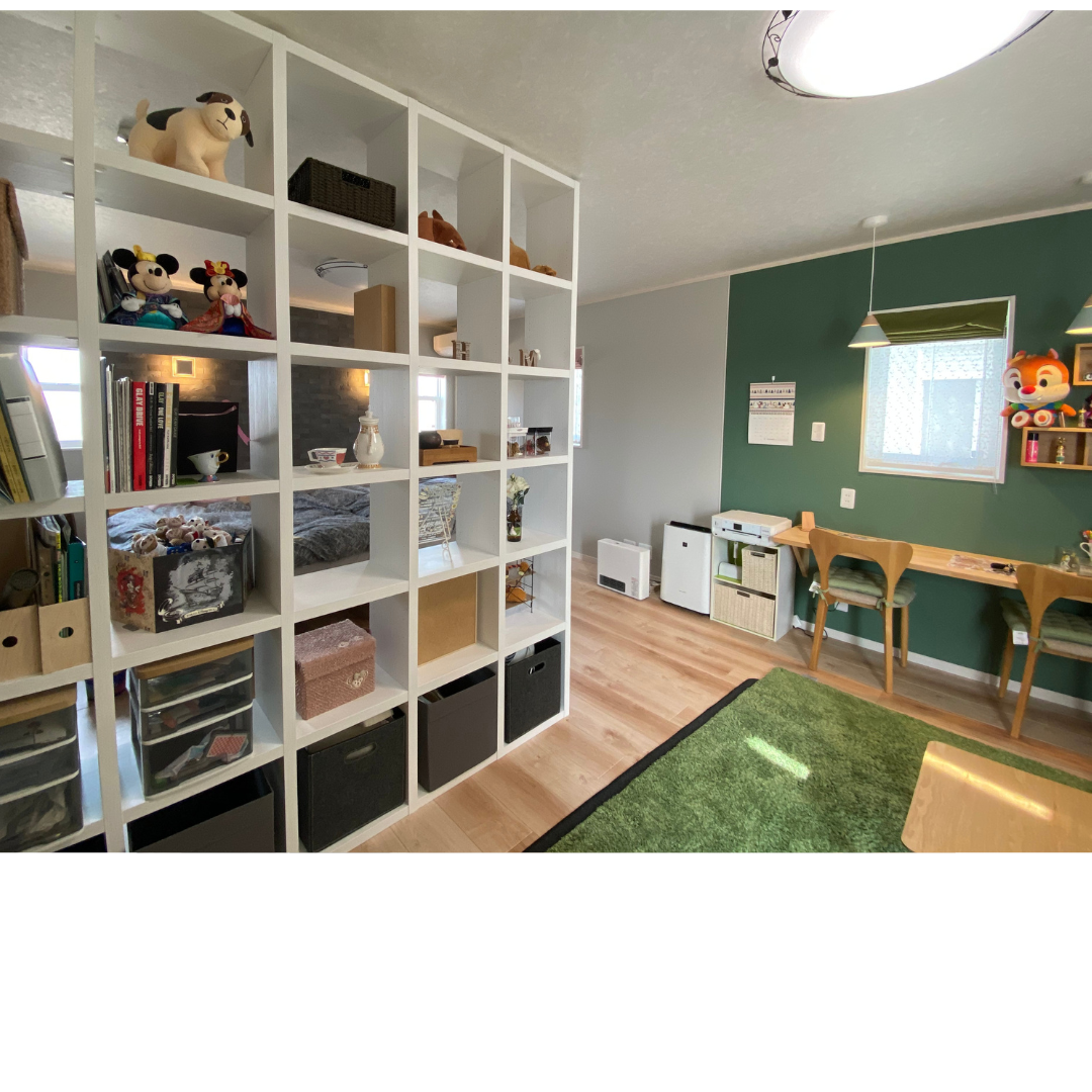 完全に仕切らないオープン棚で空間を分ける