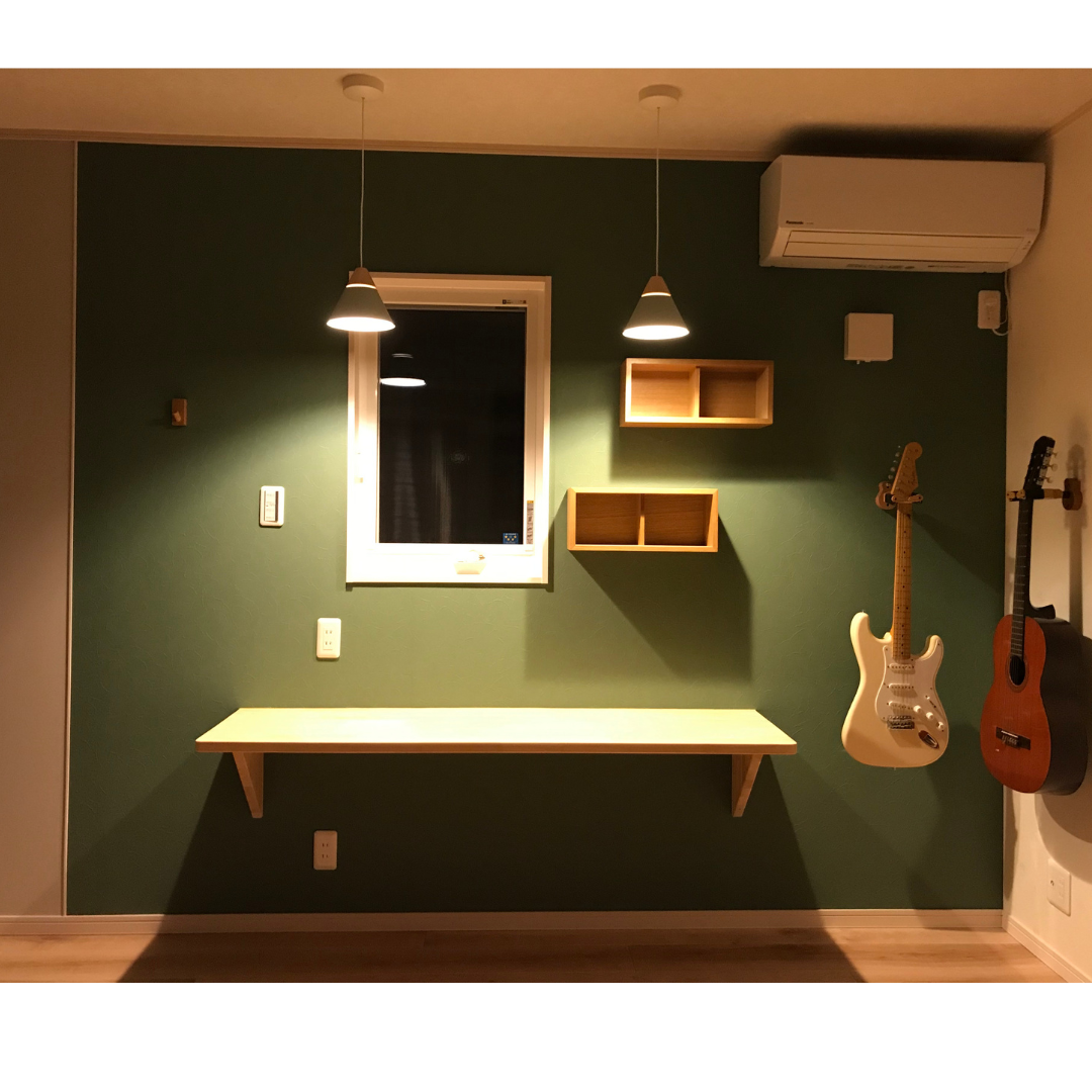 お部屋の奥にあるワークスペースの壁は、