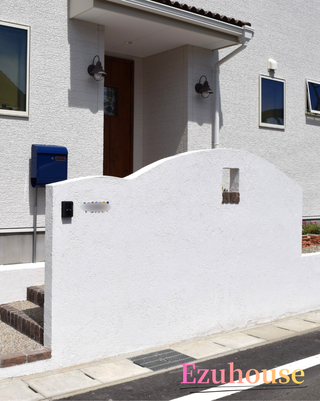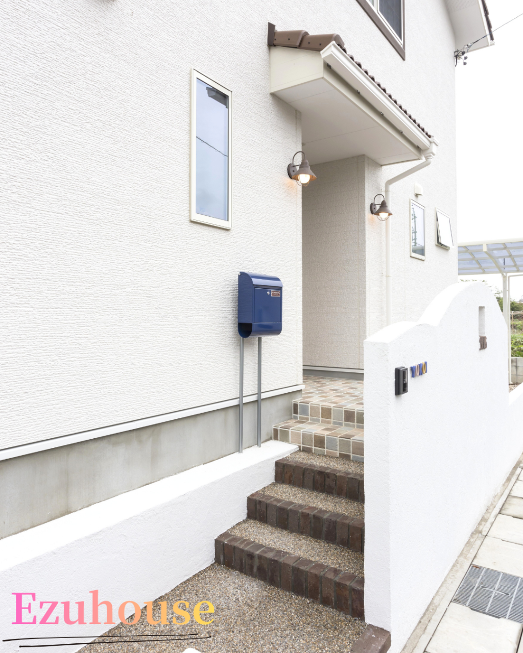 【一宮市】【工務店】白をまとった外観に、ブルーの差し色が映える“物語のはじまり”の玄関アプローチ